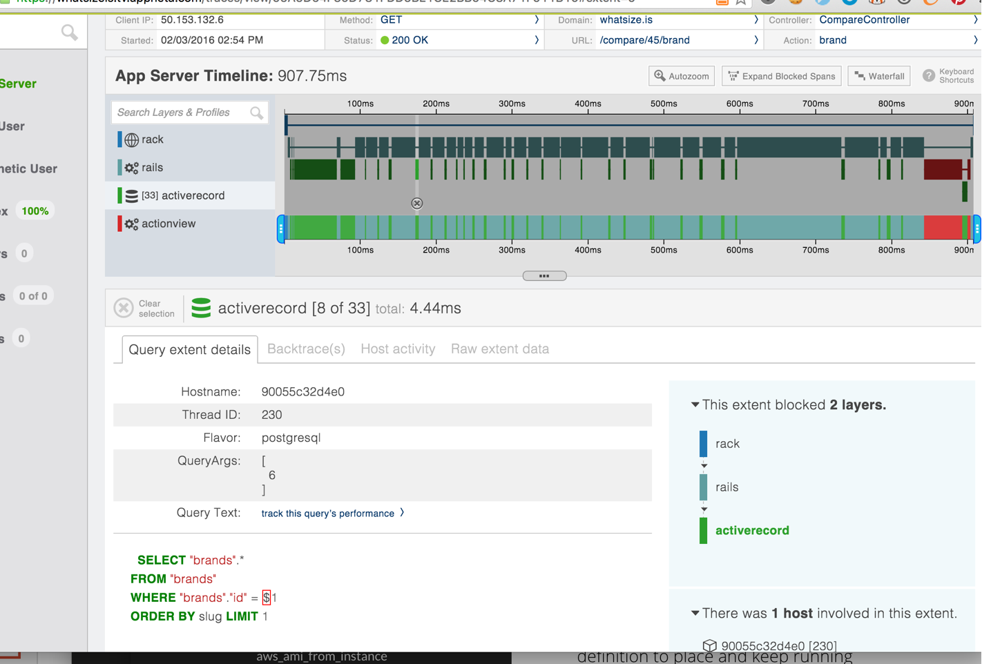 Every single request you get a little blue mark. Great you say, but get this! Drag a rectangle around them and you can slice into those requests, then for each of them you get a full freaking overview of just what happened in that request. Even the SQL. So freaking good.
